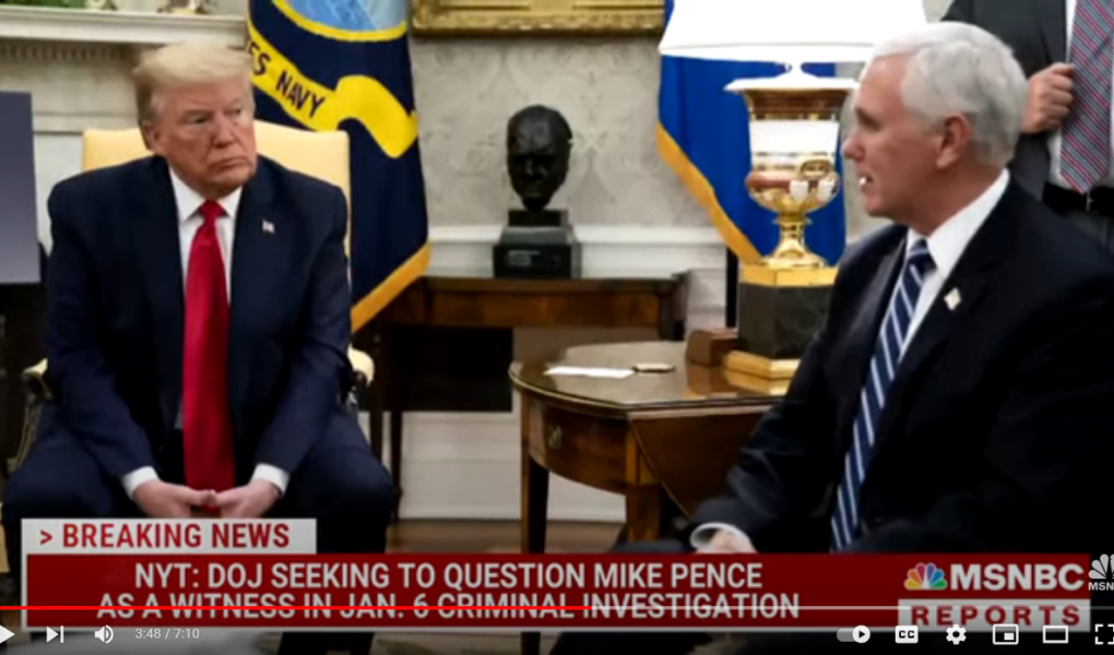DOJ Department of Justice, January 6 Committee, January 6 DOJ Probe, January 6 Hearings, Mike PenceNYT: DOJ Seeking To Question Pence As Witness In Jan. 6 Investigation by Kiraupdated on November 23, 2022November 23, 2022Leave a Comment on NYT: DOJ Seeking To Question Pence As Witness In Jan. 6 Investigation New York Times correspondent Mike Schmidt reports that the Justice Dept. has reached out to former Vice President Mike Pence’s representative wanting to question him in connection to the January 6 investigation into Donald Trump. Jack Smith Share this: Click to share on Facebook (Opens in new window) Facebook Click to share on X (Opens in new window) X Like this:Like Loading... Related