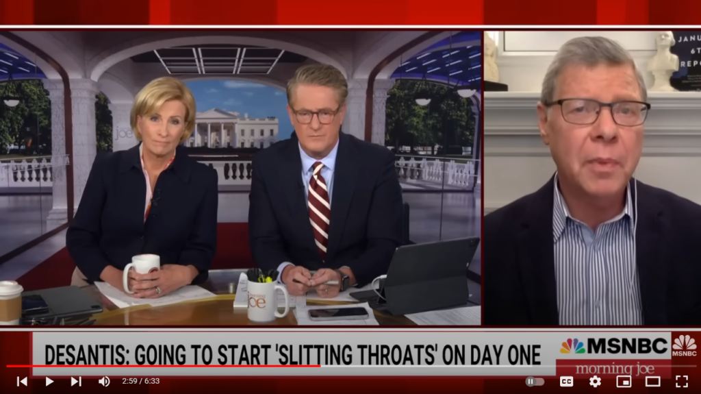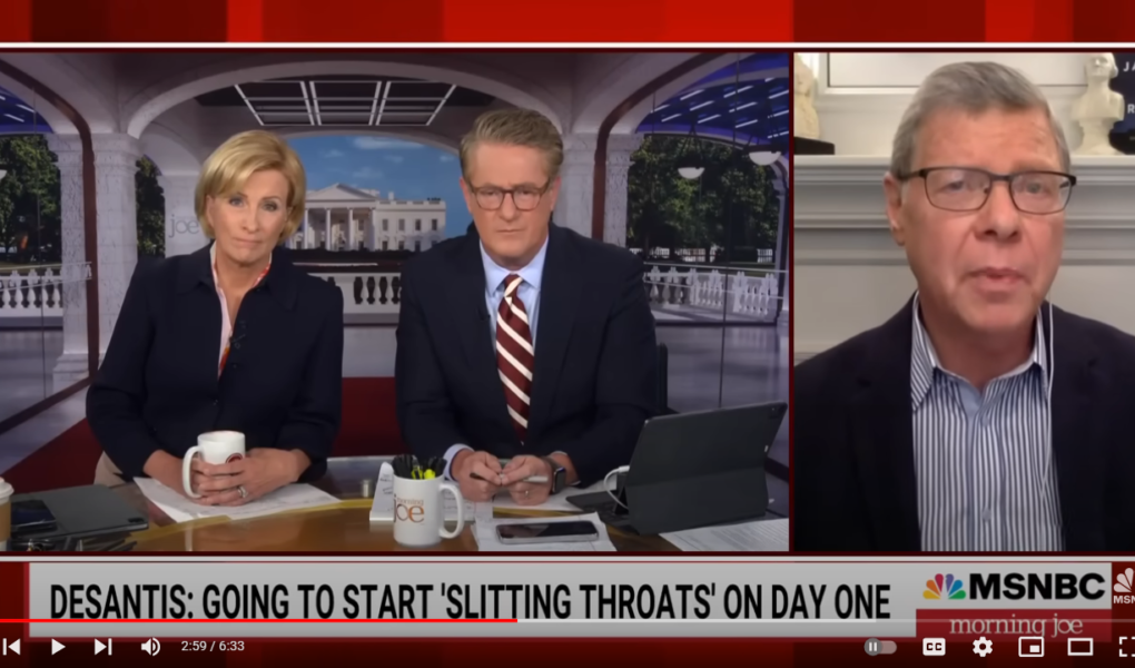 2024 Republican presidential candidate, Gov. Ron DeSantis of Florida, while in New Hampshire criticized the federal bureaucracy as the ‘deep state’, saying on day one of his office he would start ‘slitting the throats’ of bureaucrats. The Morning Joe panel discusses DeSantis’ violent rhetoric.